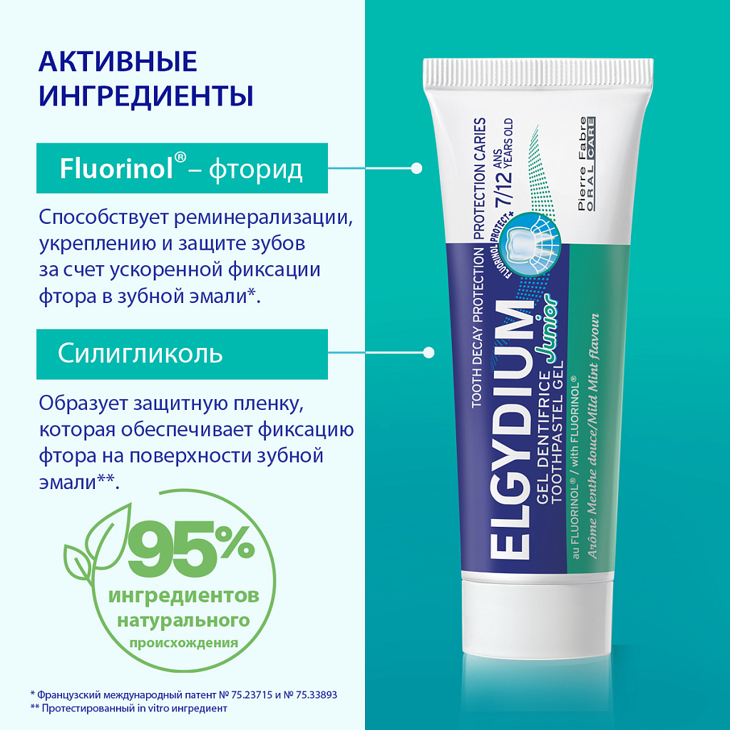 *Международная Ассоциация Стоматологов рекомендует концентрацию от 1000 до 1500 ppm ионов фтора в зубных пастах для детей в возрасте от 7 до 12 лет. (1) Патенты зарегистрированы во Франции в 1975 г. № 75.23715 и № 75.33893