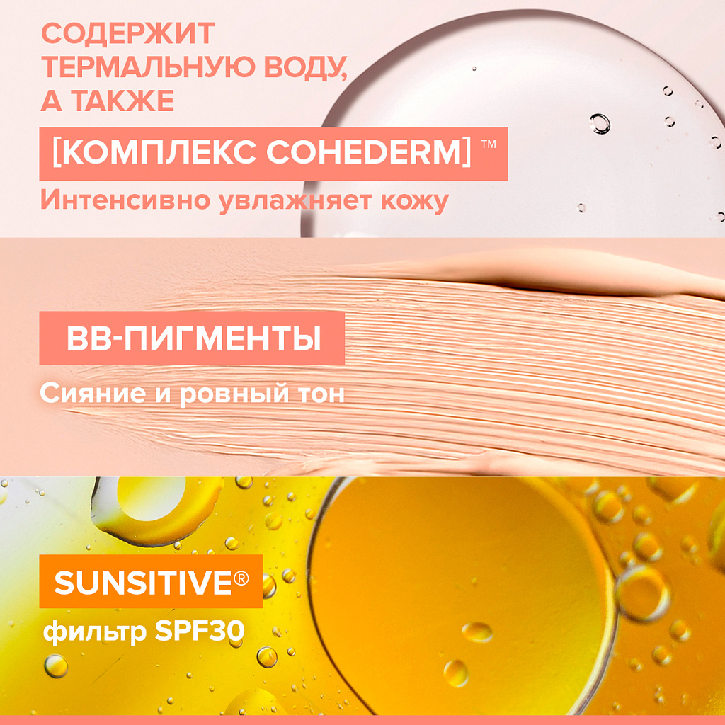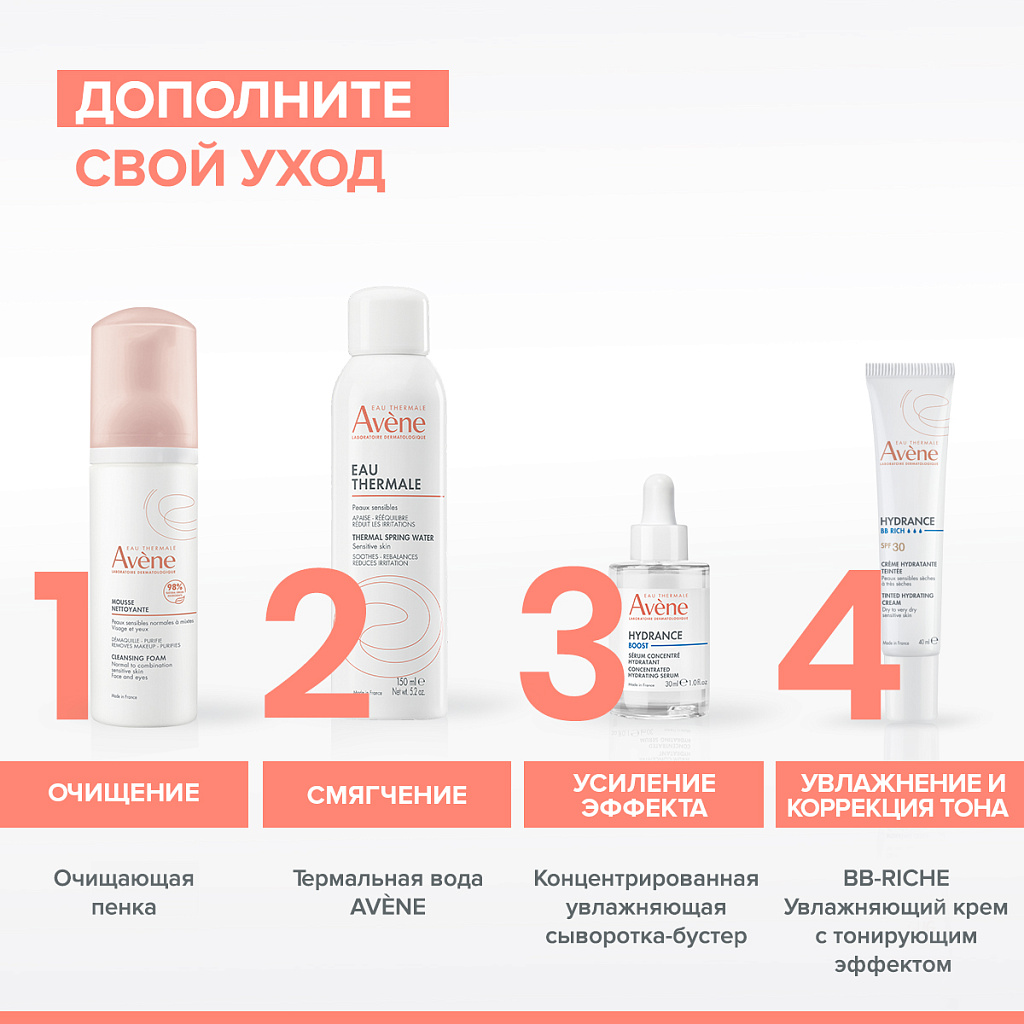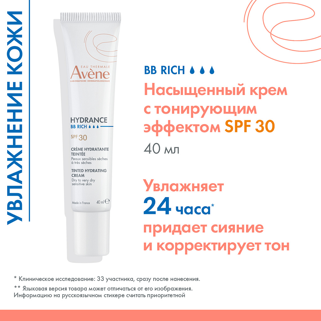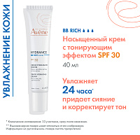 AVENE HYDRANCE BB-RICHE SPF 30 Увлажняющий крем с тонирующим эффектом подходит для сухой и очень сухой чувствительной кожи, для обезвоженной кожи лица с ощущением стянутости, огрубения, дискомфорта и потускневшим цветом.