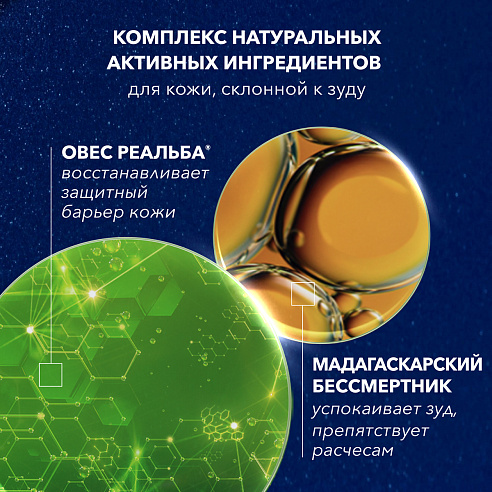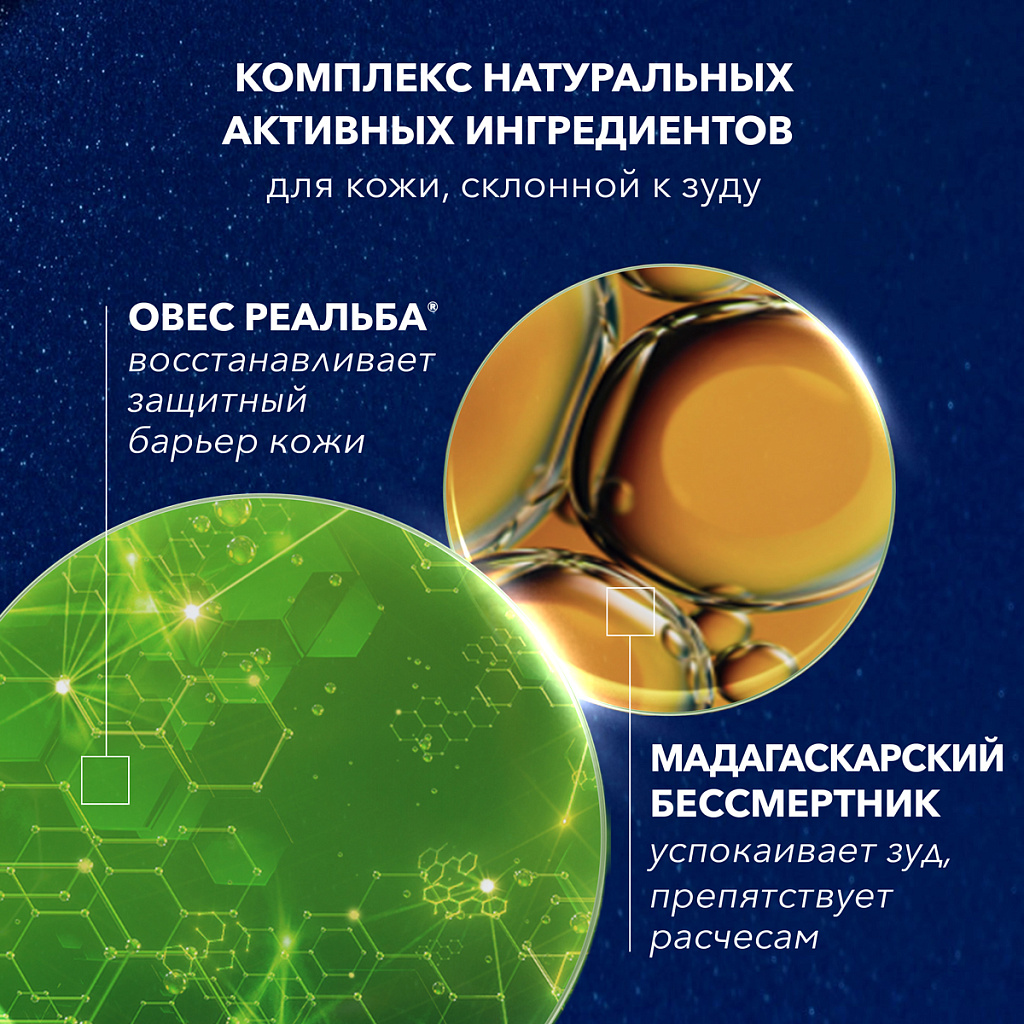 Содержит запатентованный ингредиент - экстракт ростков овса Реальба®, полученный органическим способом. Реальба® — это особый сорт овса известный своими уникальными свойствами, эффективно успокаивает, обеспечивает защиту и бережный уход за кожей, обладает высокой переносимостью.