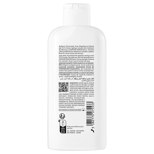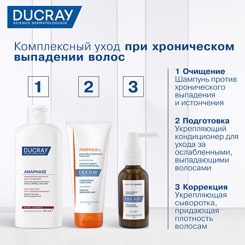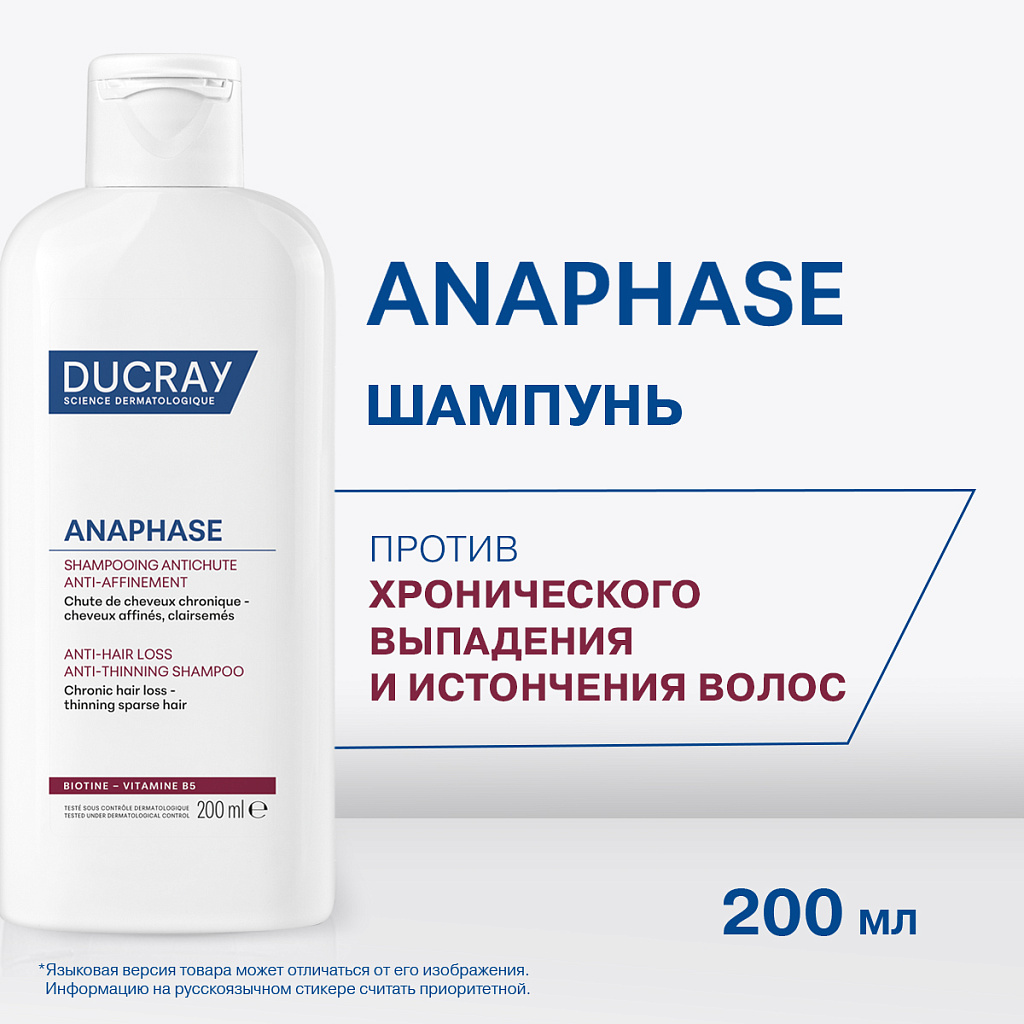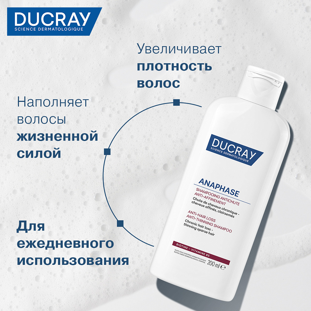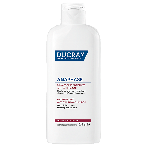 ANAPHASE+ (Анафаз плюс) для ослабленных и выпадающих волос от Лабораторий DUCRAY - первый шампунь с клинически доказанной эффективностью, который укрепляет и питает волосы, увеличивает их плотность и восстанавливает объем, улучшает микроциркуляцию и подготавливает кожу головы к нанесению наружных средств против выпадения волос.