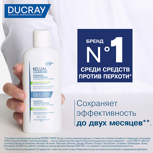 Шампунь против жирной перхоти KELUAL SQUANORM сочетает в себе нежную очищающую основу 5 ключевых компонентов: